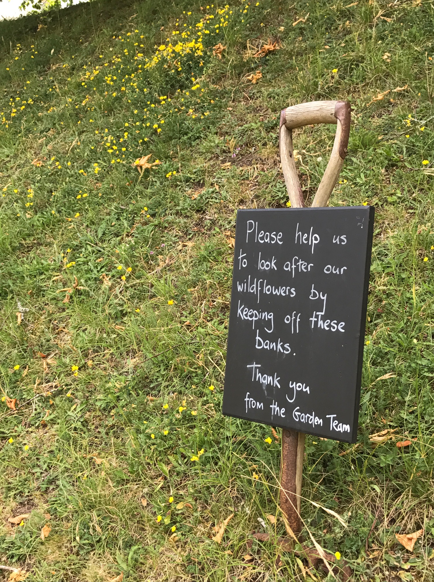 One either side of the path, banks of wildflowers guide you down from the entrance towards the manor house. A particularly nice touch is the ‘keep off’ signs, which are garden forks and spades stuck into the banks with hand-written chalkboards on them.