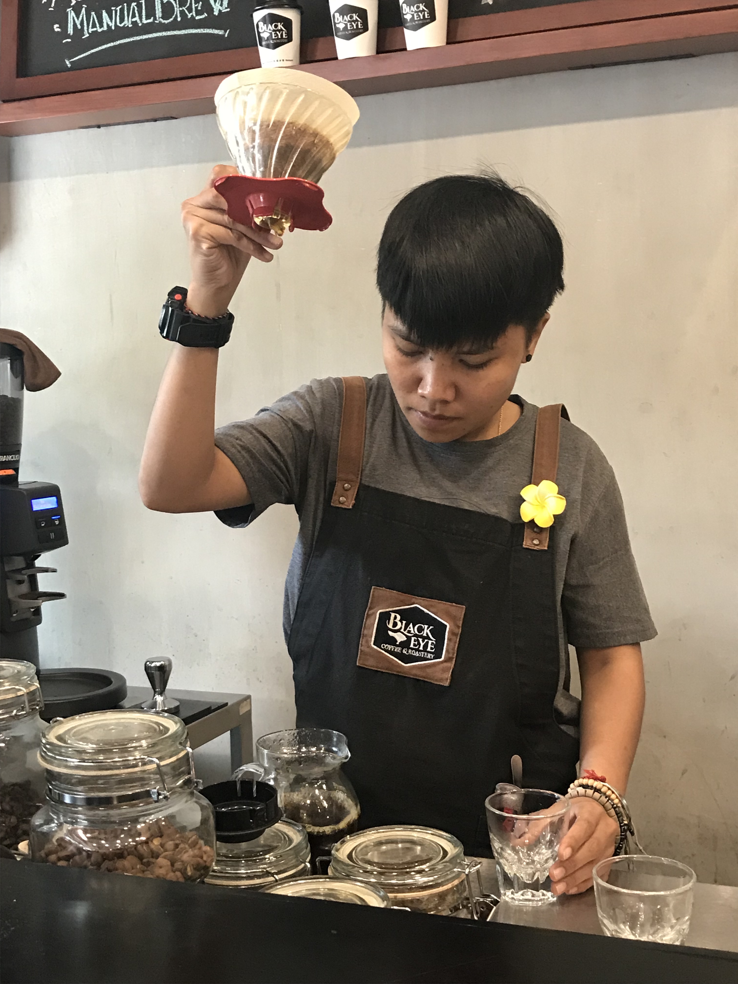 Black Eye Coffee is an unassuming, open-fronted store on a packed run of shops on the main drag through the town. It caught our eye thanks to the efforts of the team member out the front who offered to sell us some of the brand’s beans – they have a roastery at their Kuta branch – before inviting us in to sample the coffee.