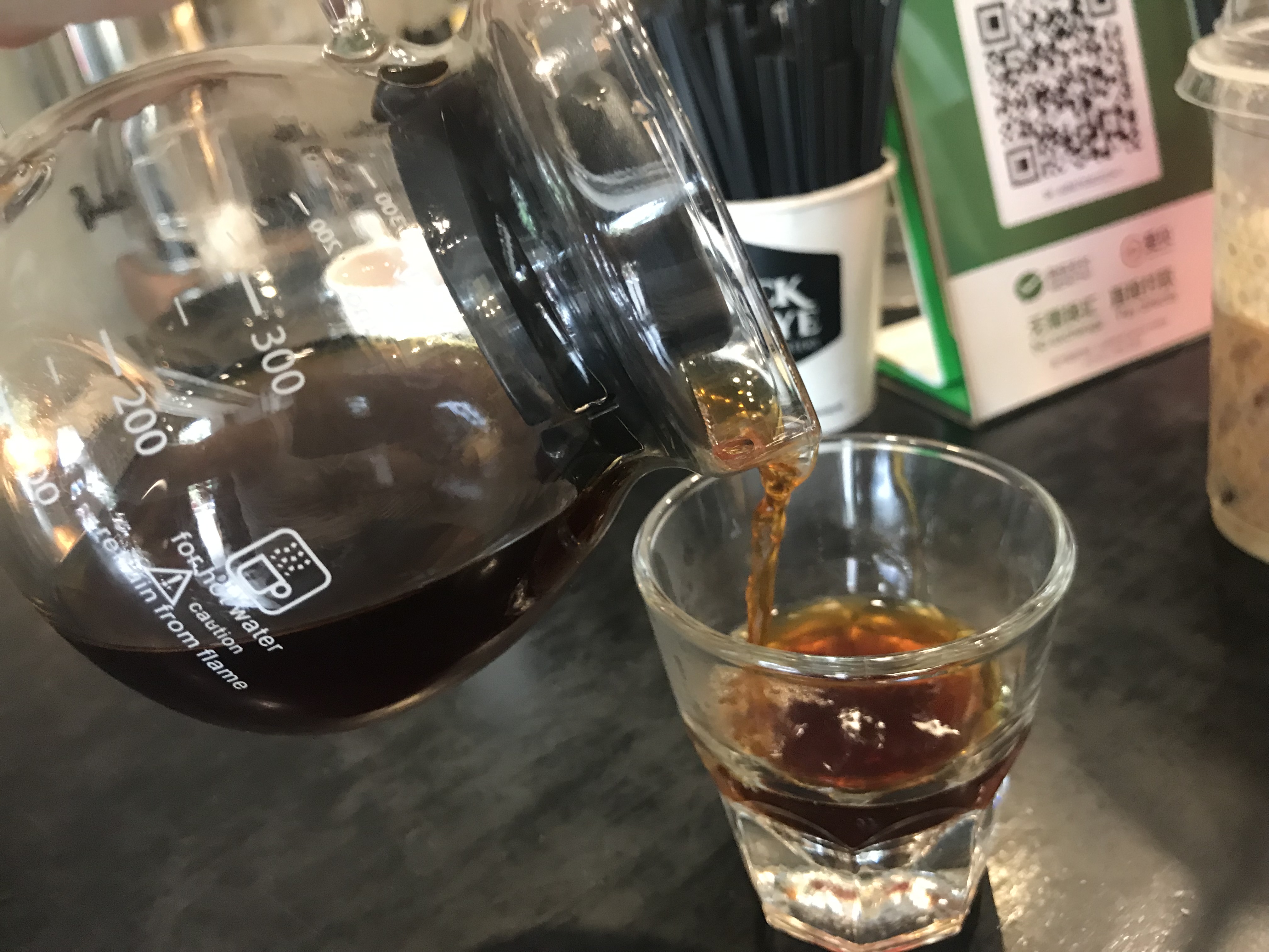 The pot which arrives is accompanied by a small glass, from which you can drink the black nectar it produces. It makes about three cups and it is worth the time to savour every drop.